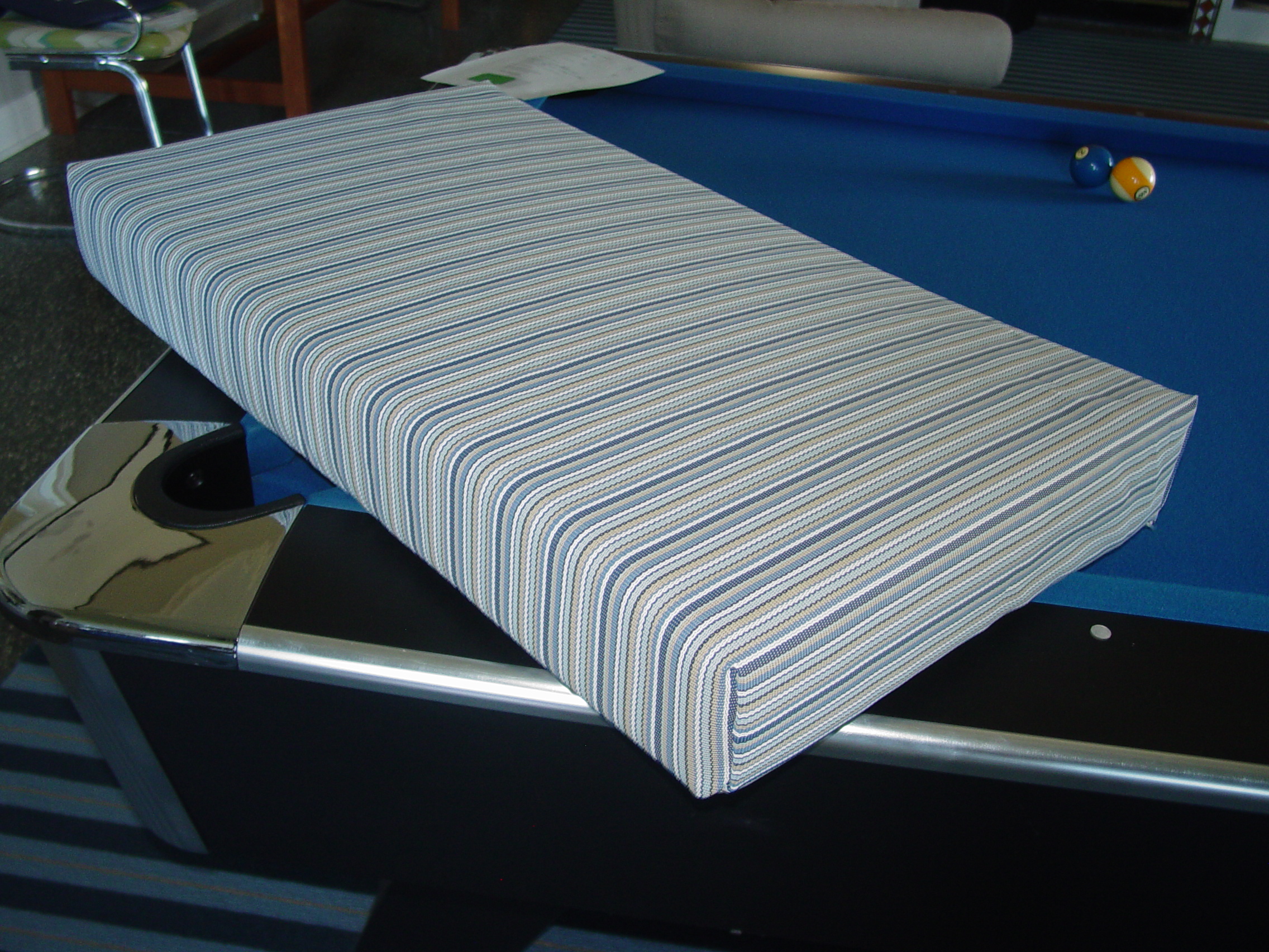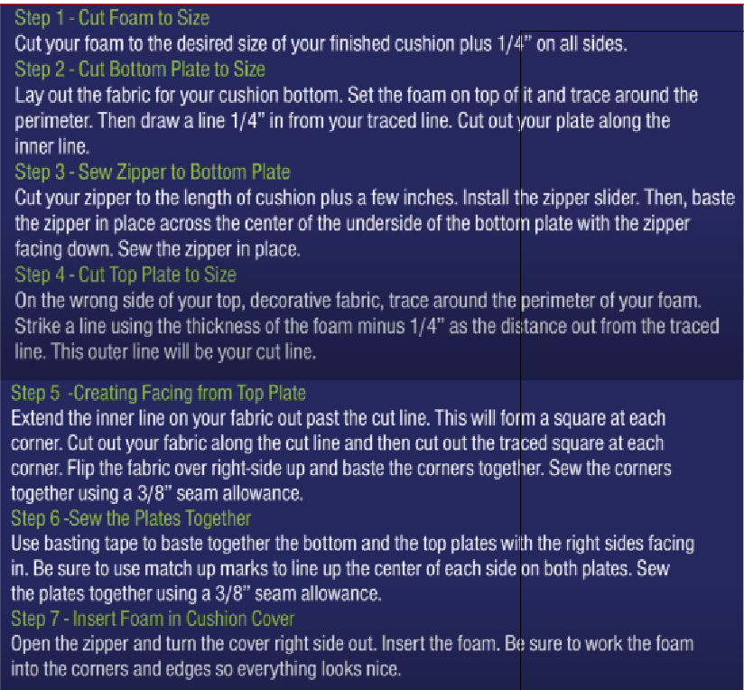 I want to display the "7 steps" page from the video here since it succinctly captures the work to be done if a fabric bottom is employed. The platform cushion is made in nearly the same way but without step 3. And the steps 6 and 7 are replaced by stapling the cover to the backing board over the foam.