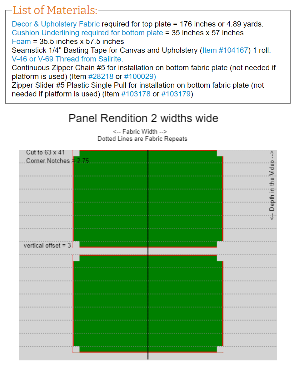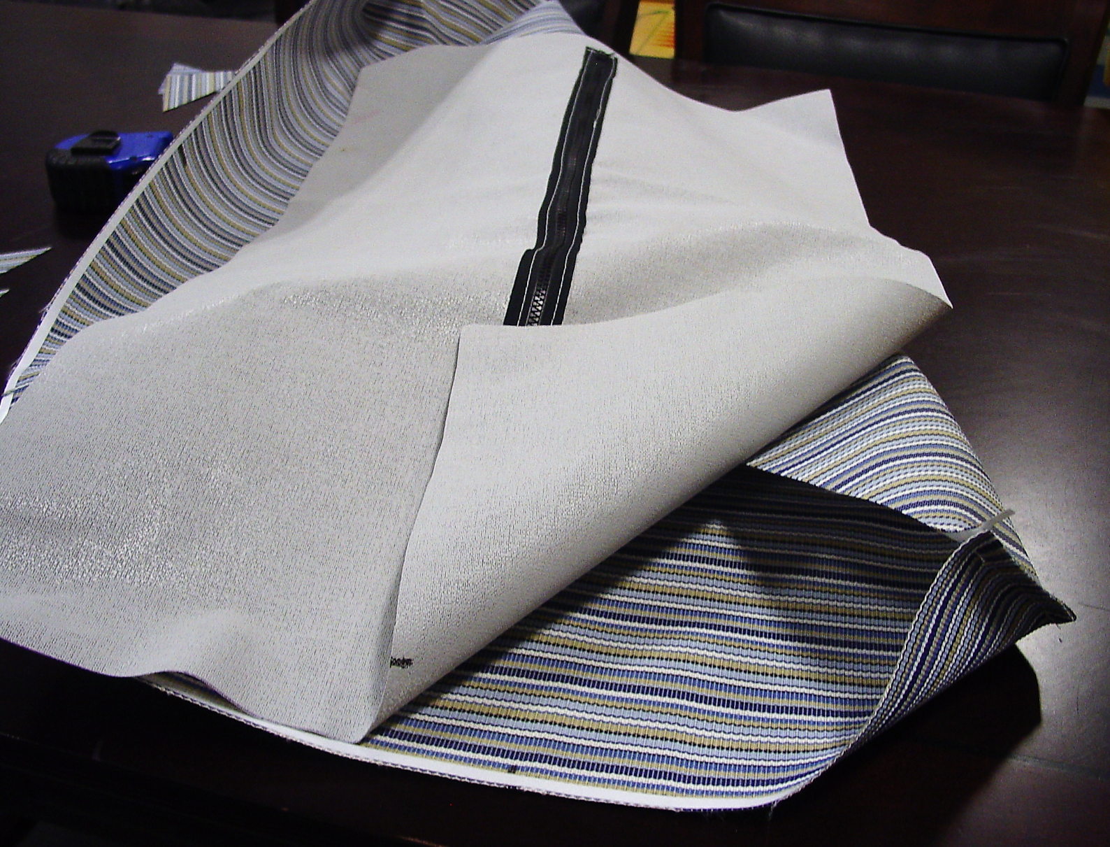Almost any fabric can be used for a fold over cushion. Of course we all have preferences. I like GeoBella and Sunbrella outdoor fabrics for their stain resistance and durability. But other choices are perfectly acceptable. One important limitation if these instructions are followed to the letter -- the bottom plate (if fabric) has a zipper installed with a simple slit. This means that the fabric used must be one that will not ravel. At Sailrite we almost always use "Cushion Underlining Fabric" here. It breaths and it tends to stick to whatever surface it is on (cushions do not slide) and it is inexpensive. If a raveling fabric is selected for this plate, it will require some kind of sealing hem or binding on the zipper slit edges. Check out the box cushion app instructions for help with this procedure.