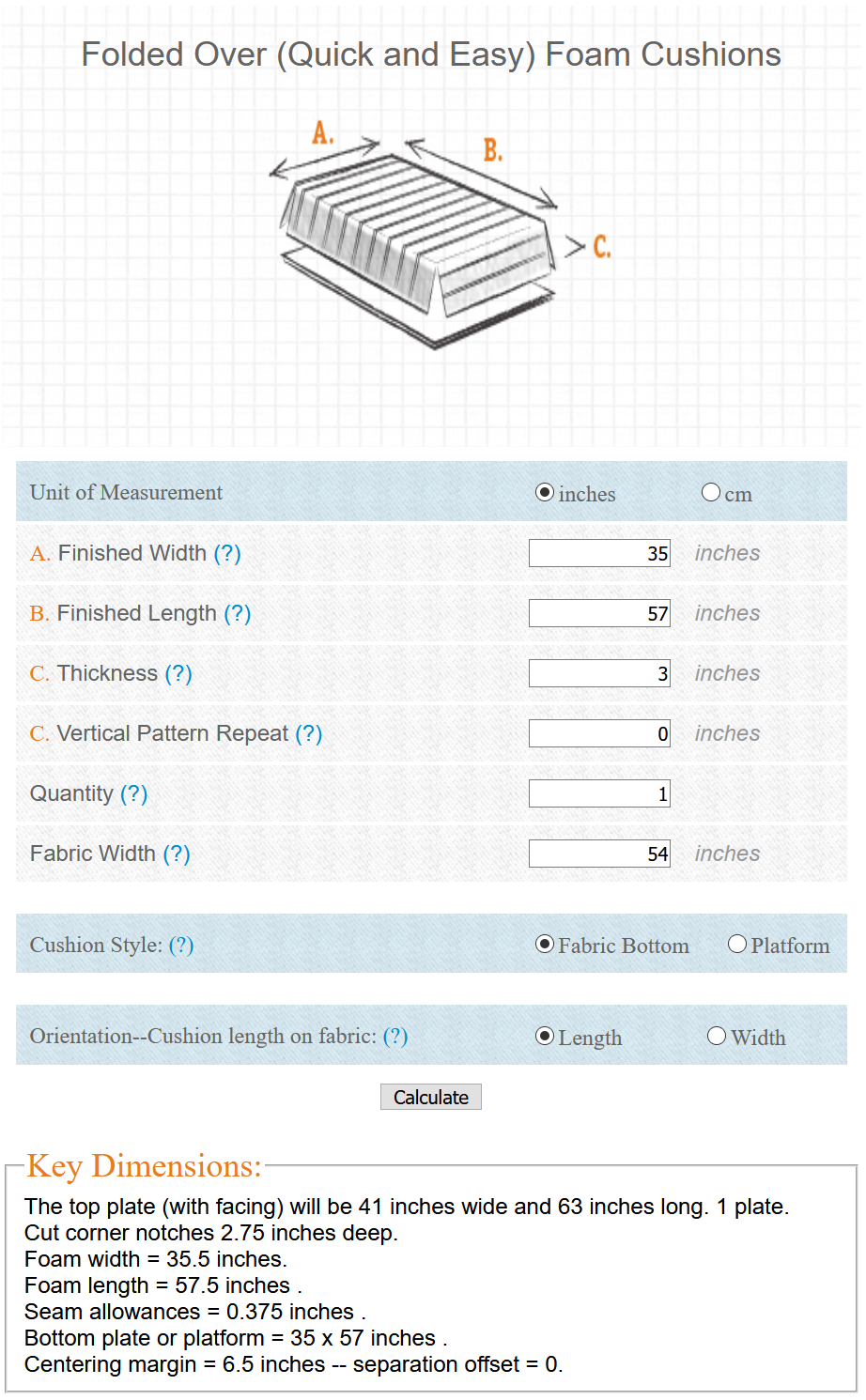 The calculator rendition will display a red borders along edges of the rendition plate to indicate seam allowance or platform overlap. If the cushion will have a fabric backing, these red areas will be as 3/8 inch (.95 cm) wide. If there is a platform, they wil be 1 inch (2.45 cm) wide.