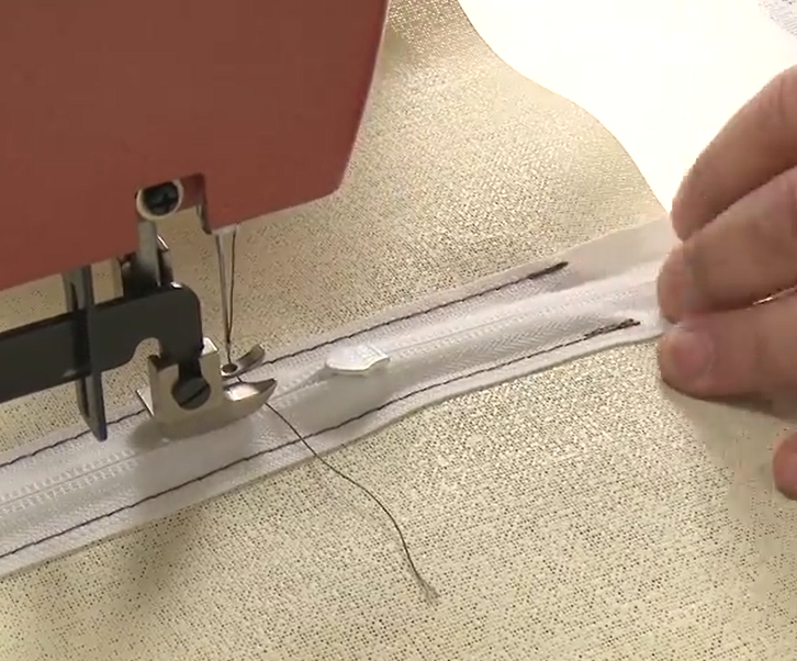 Work the zipper slider on from either end. Be careful to install it so the pull tab is up against the fabric of the backing plate. Then sew across each end of the zipper to lock the slider in place. If the machine balks at sewing over zipper teeth, simply whip round the zipper teeth at both ends by hand with needle and thread.