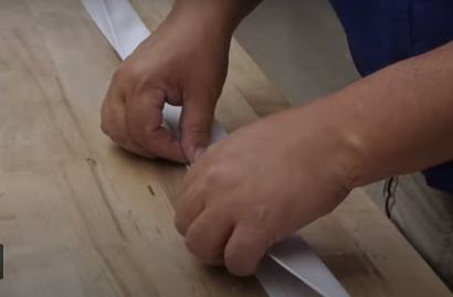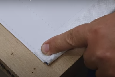 Cut 5 inch wide strips long enough to cover all the clear vinyl edges. If the material used is not likely to ravel, like the Weblon we recommend, shears can make the cutting process quick and easy. Fold 1/2 inch hems onto the "wrong " sides along the lengths of each strip. We like to place a line 1 inch inside the edges to be hemmed and fold to that line. Then fold each strip hem to hem to form a 2 inch wide facing that will be fitted over all edges of the clear plastic to reinforce it. Secure the top and bottom strips first. Transfer tape can be used to ensure the accuracy of each fold and to hold everything in place so that it can be sewn in one pass. Eric does a good job in the video explaining how all can be kept in order while performing this task.