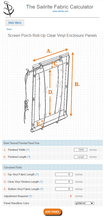 We define a roll-up porch panel as one made up of fabric with a clear window somewhere in its middle. Not only is the size of the assembled panels dependent upon your openings, so are the sizes of the top and center and bottom panel sections themselves. For these projects, you will find the calculator essential. Let's consider how best to use the calculator. (We will go over each calculator field below, but it should be noted that the same detail is also available by clicking on the "?" at each label -- click on "close" to clear.)
