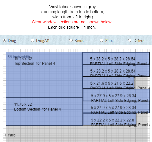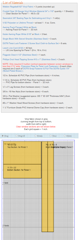 Each time the "Add Panel" button is pressed, all the component window panels (by number in the list of materials) and the component fabric panels (by color in the rendition ) required for that porch panel will be created. The component fabric panels in the rendition are crudly "nested" by the software -- all facing strips will be vertical either to the right of the component panels or below them depending on overall size. They can be dragged from there to any location on the rendition either one panel at a time (if the "Drag" radio button is selected) or all the components of a panel at the same time (if the "DragAll" radio button is selected). Each panel can also be rotated and sliced to minimize the yardage required. Each time a panel or set of panels is modified, the total yardage required will be recalculated and displayed on the first line of the list of materials that is displayed just above the rendition. Click on the blue colored text in the list of materials to hyperlink to the Sailrite website where the items can be ordered -- place them in a shopping cart and then return to the calculator tab where additional blue text can be clicked and thus added to the existing cart. All will be preserved as you move from the calculator to the website and back until the cart is filled with all needed supplies which can then be ordered with just a click or two.
