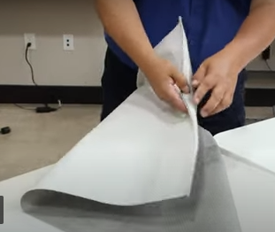 Clear vinyl can be easily scratched during the sewing process. We like to prevent scratching with a pad of Protect-It™ Gray 63" Fabric (part number 122679) secured with Velcro tape at strategic points to the sewing surface as shown in the Video. Note that this protective fabric is not included in the Calculator 's list of materials since its size will be dependent on your work space.