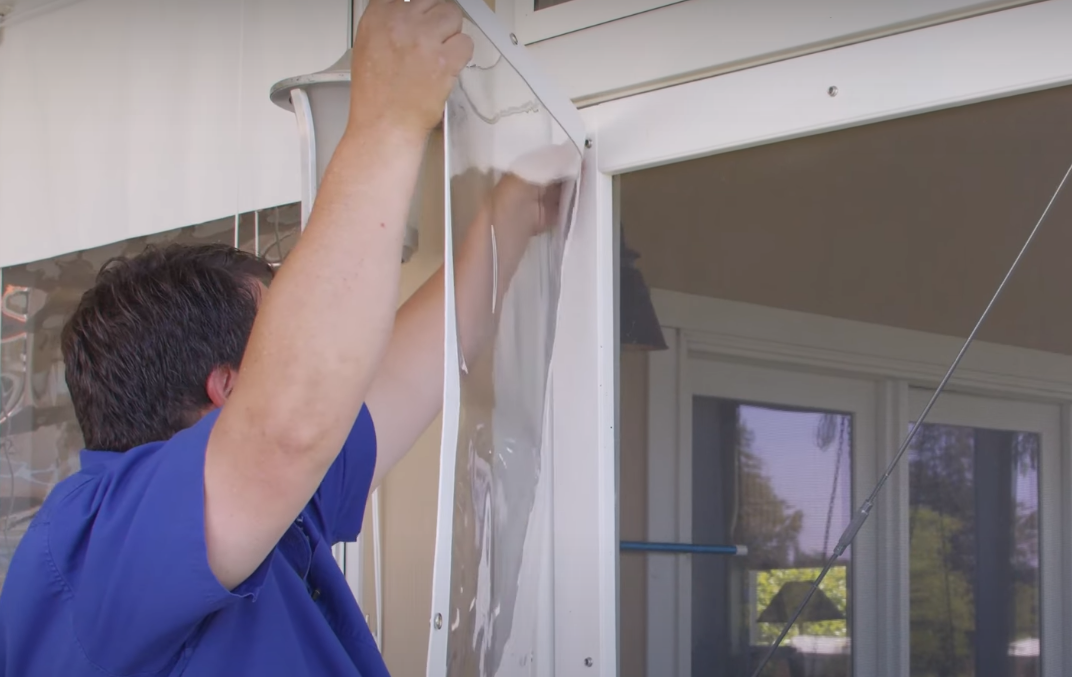 Porch panels are fabric and clear vinyl assemblies that can be deployed to cover screened openings. They can thus be used to "weatherize"spaces that might otherwise be unusable in inclimate weather. Even so, they are easily rolled away or removed entirely to take advantage of better conditions.