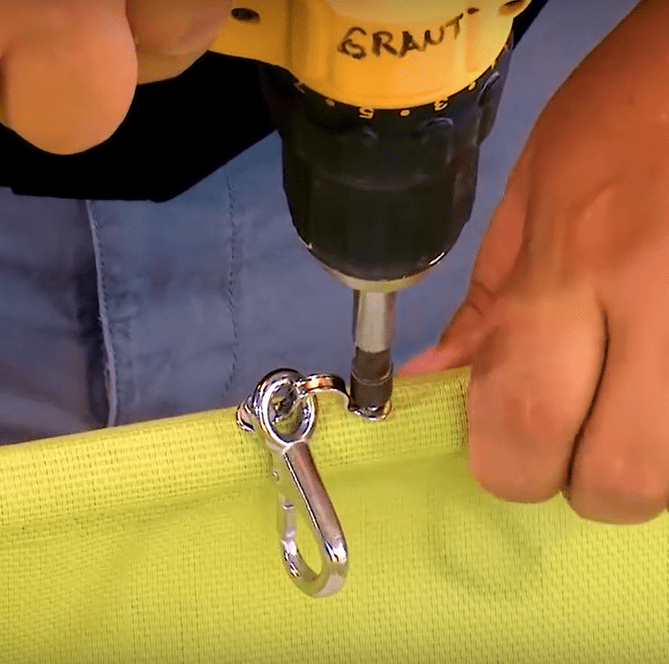 Tubing Insertion: Next insert the tubing into the sleeve carefully (it should fit very snuggly inside the sleeve). Once the pipe is inside the sleeve, you may need to rotate the pipe until the holes in the fabric line up the holes in the pipe. (HINT: Use a pair of needle nose pliers to rotate the pipe inside the sleeve. Line up one side at a time then move to the other and repeat the process.) Position a Strap Eye with a Fixed Eye Snap in place on the strap eye. Then use the #8 self-drilling screws and secure the strap eye. Repeat these steps for the opposite end of the sleeve. Ensure that the hardware on both ends of the sleeve is centered at the top edge of the sleeve. Repeat this process for each tubing/sleeve assembly.